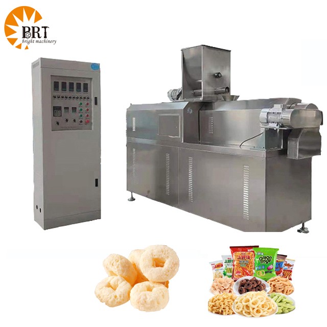 La línea de video de inflado se refiere a que el material se tritura, se mezcla, se humidifica, en la extrusora en espiral, el material en la extrusora a través de vaporización a alta temperatura y a través de un orificio de matriz especialmente diseñado y alimentos inflados. Las materias primas son principalmente harina de maíz, arroz, harina y otros almidones de grano. Los alimentos producidos por la máquina infladora son pequeños, variados en forma y bellamente envasados